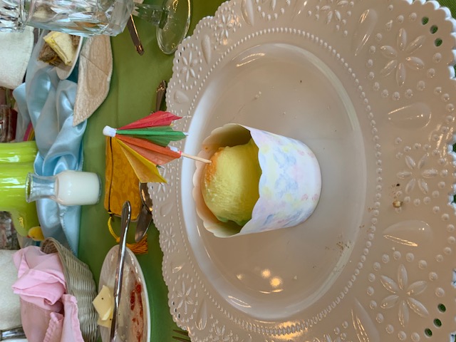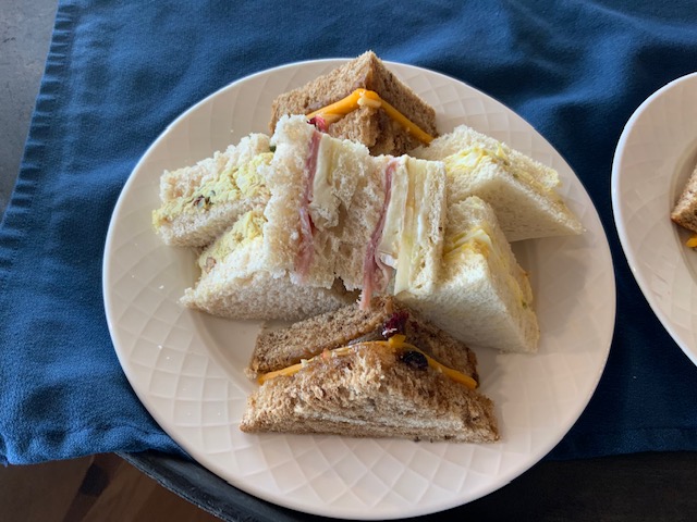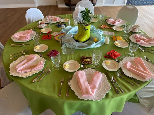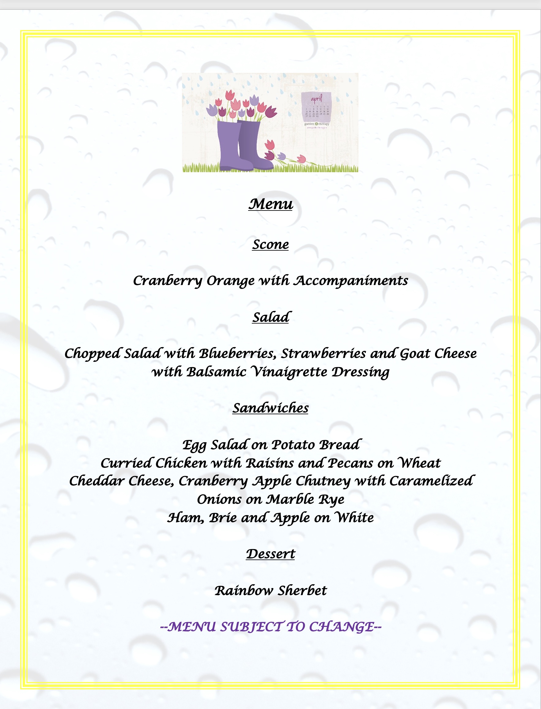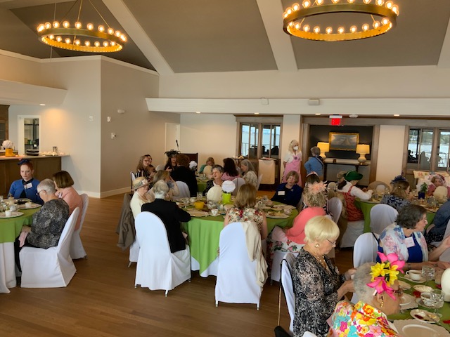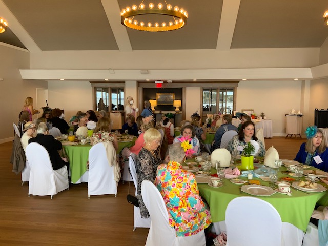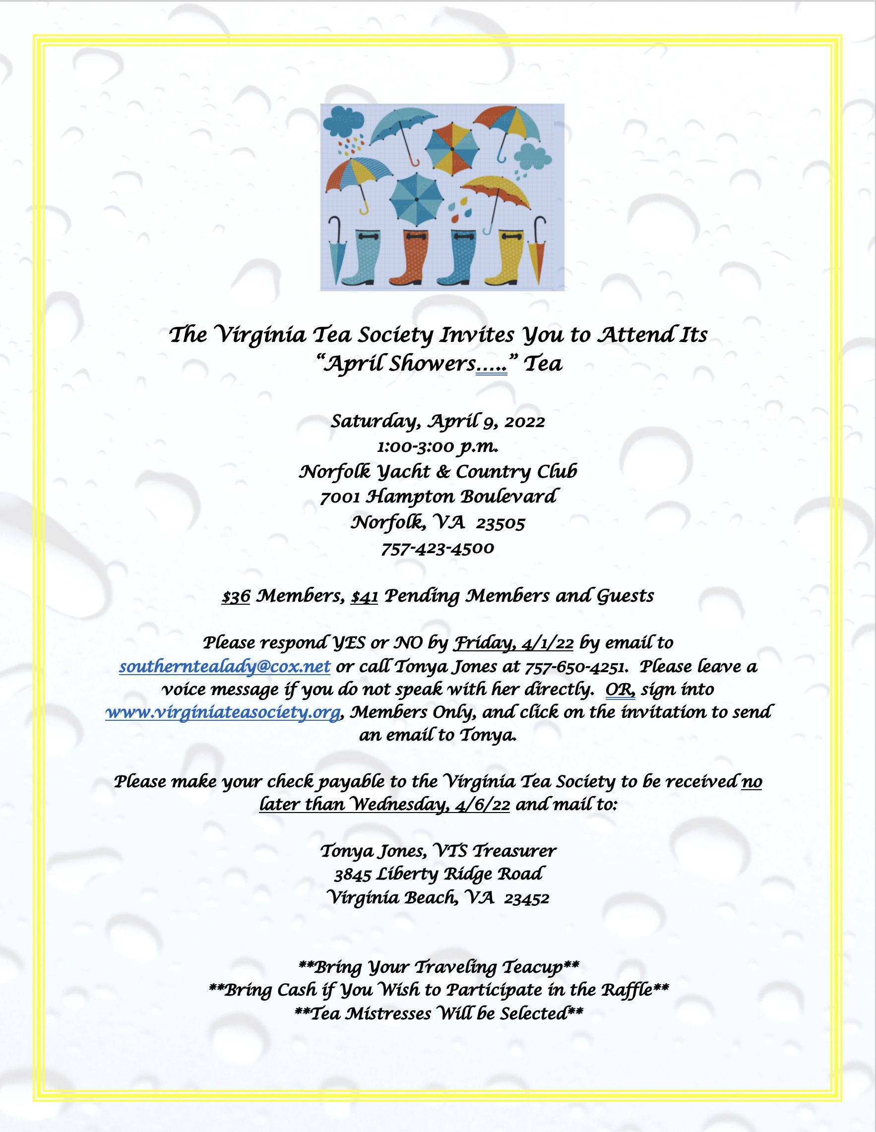 The VTS April theme was "April Showers..." - a celebration of Spring on the way. It was held on April 9, 2022 at the Norfolk Yacht Club where we all enjoyed the wonderful food, the exquisite tea and a beautiful view of the water and the yachts from the vantage point of the upper floor of the Club. The centerpieces carried the theme with rain-boots on blue water puddles with white clouds hovering above the new green sprouts, not yet blooming. The raffle and door-prizes were a great success and lots of fun.