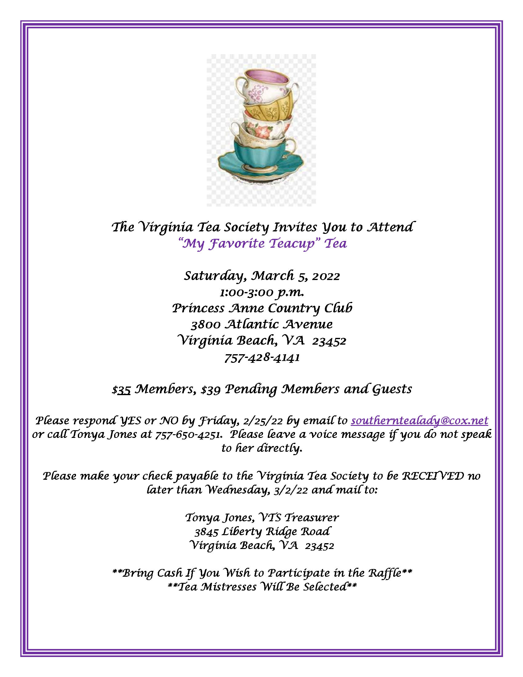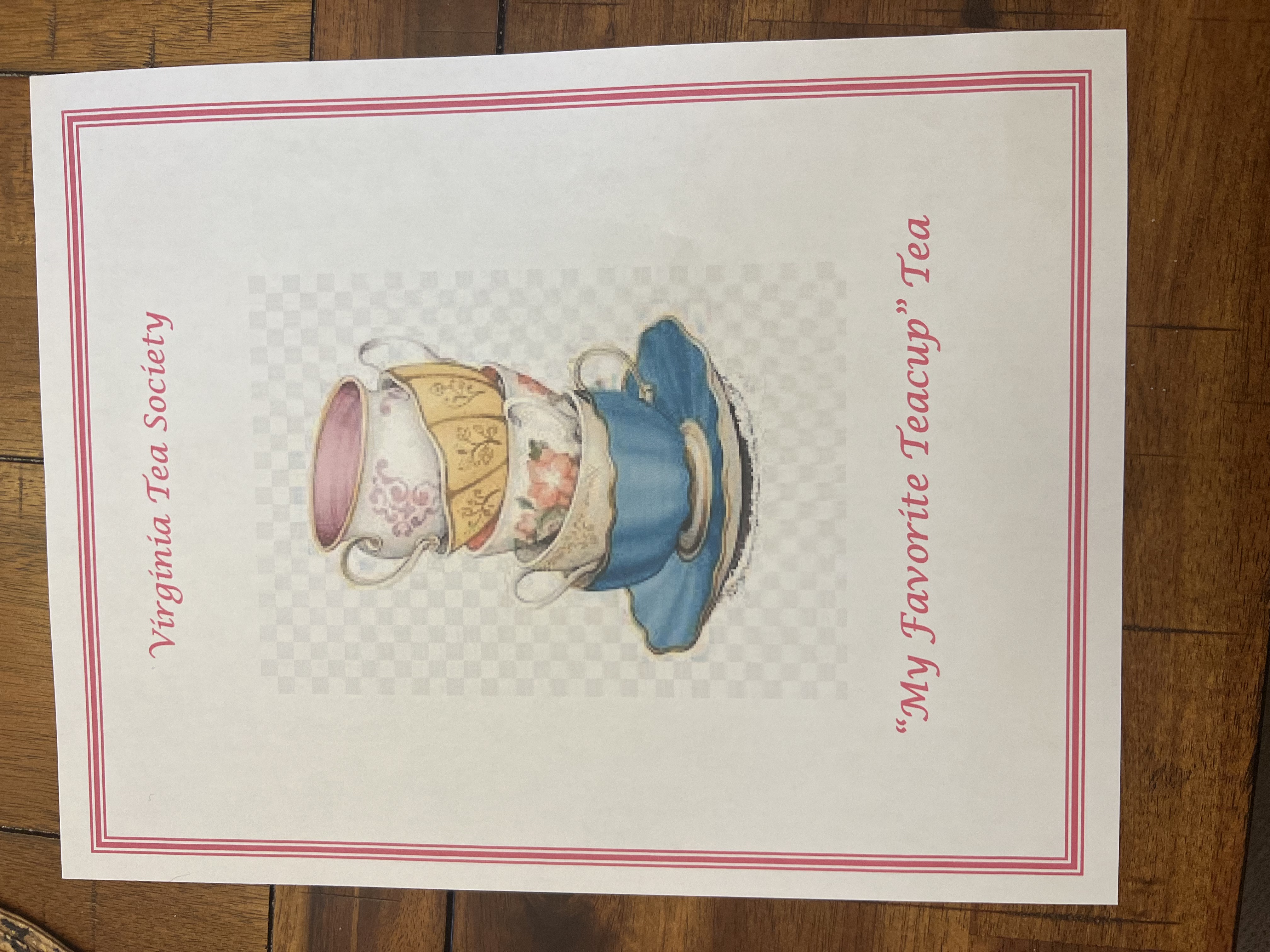 The Virginia Tea Society held its “My Favorite Teacup” tea on Saturday, March 5, 2022 from 1:00-3:00 p.m. at Princess Anne Country Club in the Princess Anne Room. Attendees brought their favorite teacups to display as part of the centerpieces for each table. Several attendees stood up to explain what their teacup meant to them and why it was so valuable. Anne-Taylor Cahill gave a presentation on antique and very valuable commemorative cups from her personal collection. Her Majesty Queen Elizabeth II (played by Nancy Jones) had a proclamation that she read at the end. Each attendee received a lovely cup and saucer to take home as a favor along with a placemat, bookmarks and printed tea quotes.